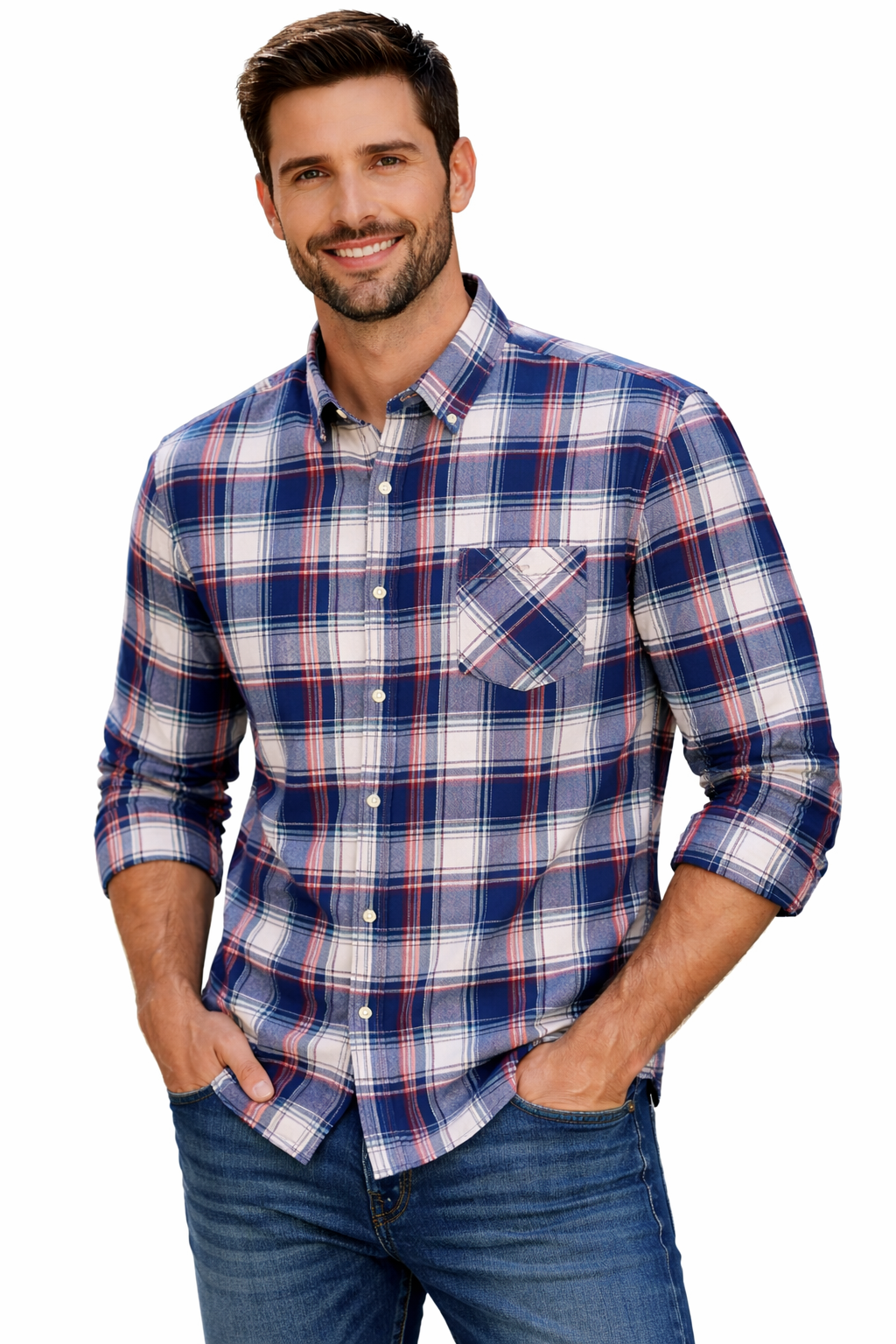 Upgrade your everyday style with this classic checked cotton shirt, designed for a smart and versatile look. Featuring a bold yet balanced check pattern in rich blue, white, and subtle red tones, this shirt delivers a timeless appeal suitable for both casual and semi-formal occasions.