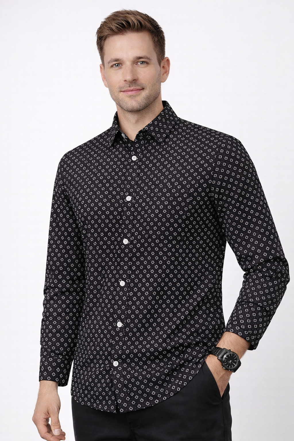 Elevate your everyday style with this premium black printed shirt featuring a modern white micro-diamond pattern. Designed for men who appreciate both comfort and sharp fashion, this shirt delivers a bold yet classy look suitable for every occasion.