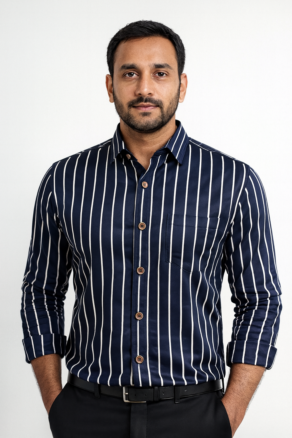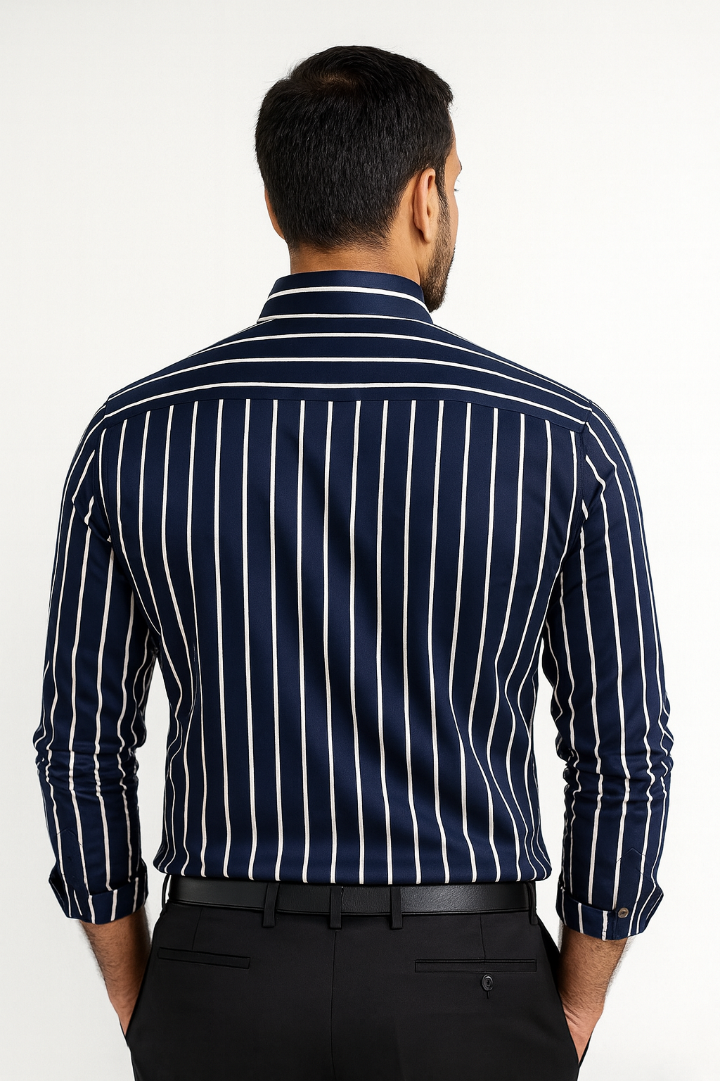Upgrade your everyday style with this premium navy blue vertical striped shirt, designed for men who appreciate comfort and sharp looks. Crafted from soft, breathable fabric, this shirt offers a smooth feel on the skin while maintaining a polished silhouette.